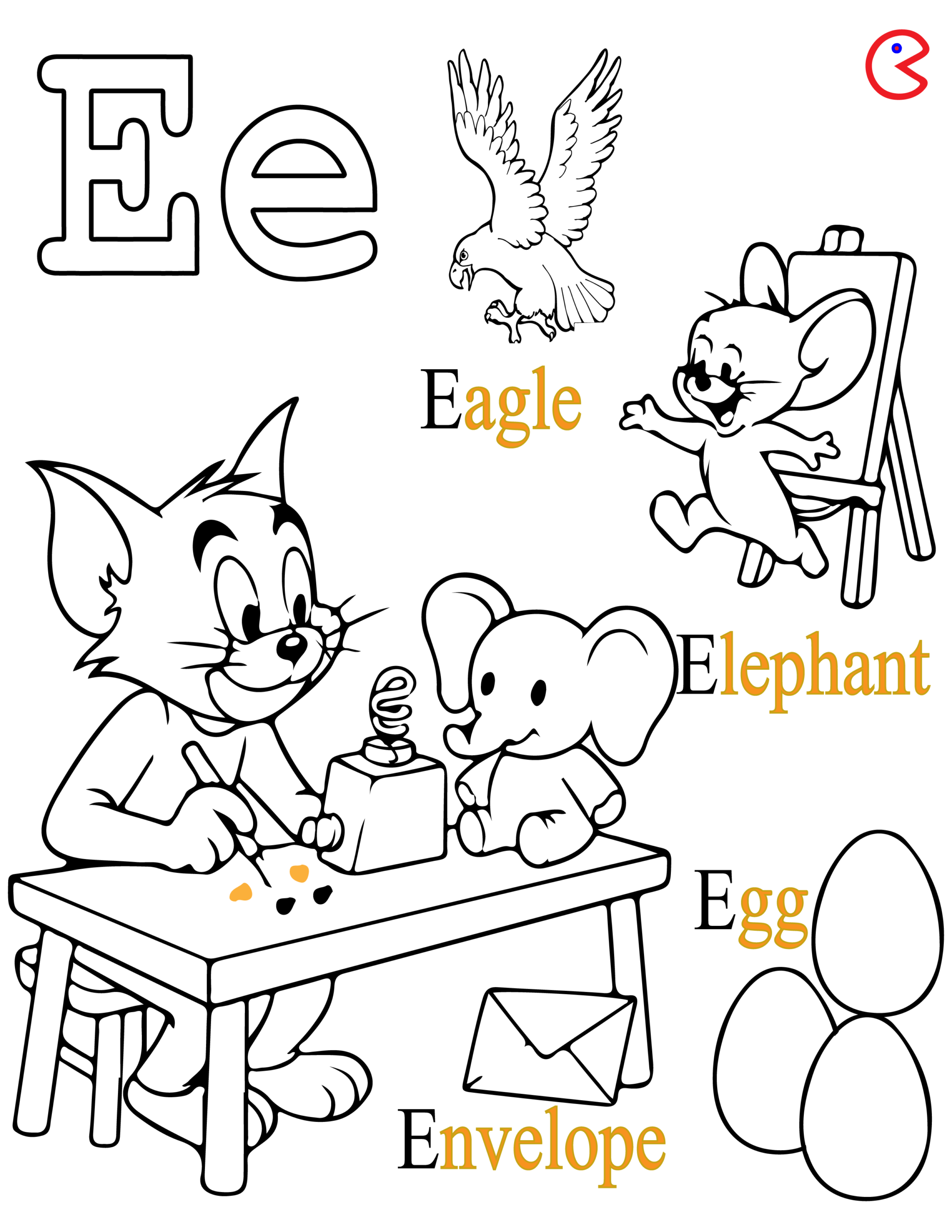 This free printable coloring page helps kids learn the letter E with fun and simple pictures.